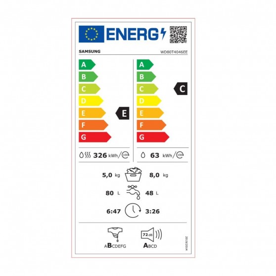 Samsung WD80T4046EE, Carga frontal, Independiente, Blanco, Izquierda, Botones, Giratorio, LED