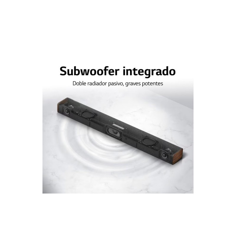 Cada detalle de LG Soundbar SP2 se ha elegido cuidadosamente para crear una estética agradable que complemente tanto su televisor como la estancia donde se coloque. Los elegantes paneles laterales en madera, los controles elevados y la tela ecológica de primera calidad lo convierten en una barra de sonido que se ve tan bien como suena.sual.
