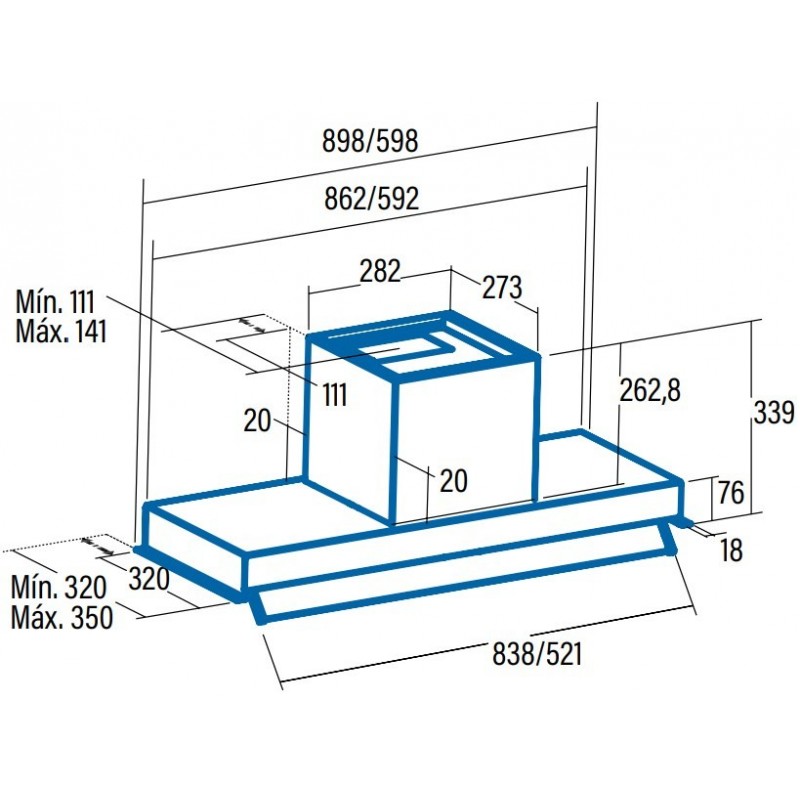 Esta campana tiene un ancho de 598 mm, una profundidad de 350 mm y una altura de 33,9 cm, lo que garantiza una integración perfecta en muebles estándar. La altura sin chimenea es de solo 7,6 cm,