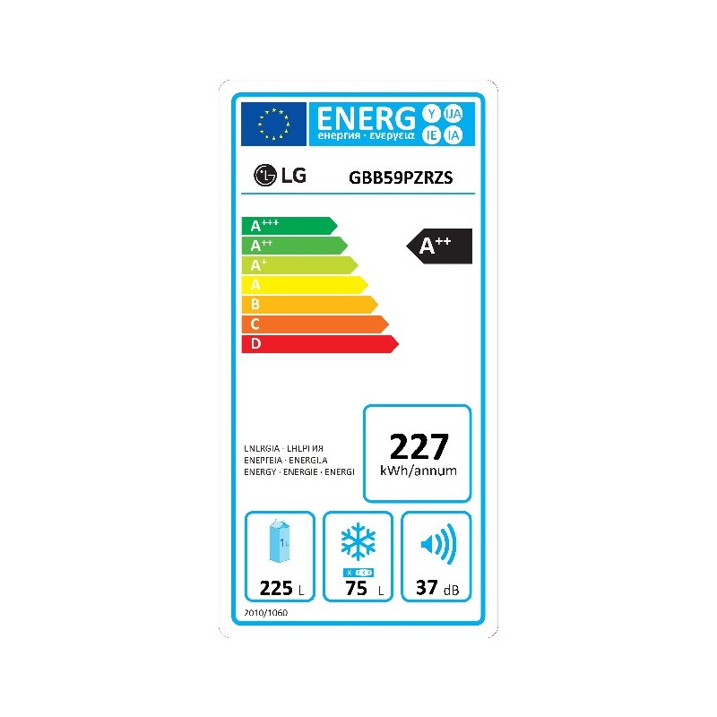 LG GBB59PZRZS. Capacidad neta total: 300 L. Bisagra para puerta: Derecho, Tipo de visualizador: LED. Clase climática: SN-T, Nivel de ruido: 37 dB. Frigorífico, capacidad neta: 225 L, Antiescarcha (nevera), Sistema multi-flujo de aire (nevera), Luz interior de la nevera. Congelador, capacidad neta: 75 L, Capacidad de congelación: 9 kg/24h, Antiescarcha (congelador). Compartimiento de zona fresca. Consumo de energía anual: 227 kWh. Color del producto: Acero inoxidable