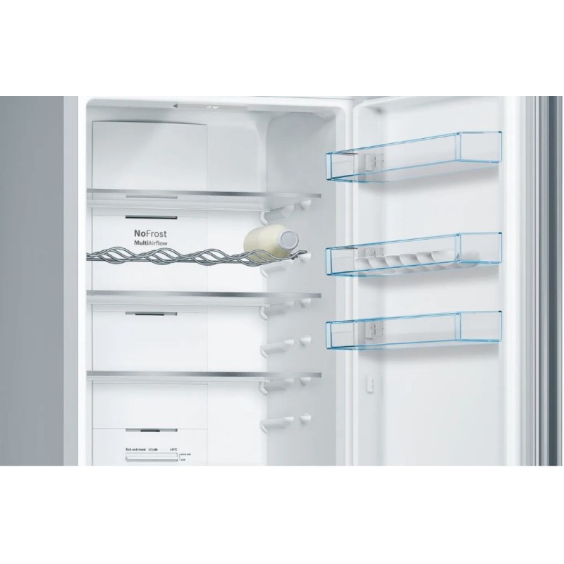 Este modelo cuenta con una capacidad neta total de 368 litros, distribuidos en un frigorífico de 279 L y un congelador de 89 L. Gracias a su diseño interior con cinco compartimentos, botellero, hueveras y cajón para verduras, ofrece una organización eficiente y práctica. La iluminación LED proporciona una visibilidad clara sin aumentar el consumo energético, mientras que la descongelación automática en ambas zonas evita tareas tediosas.