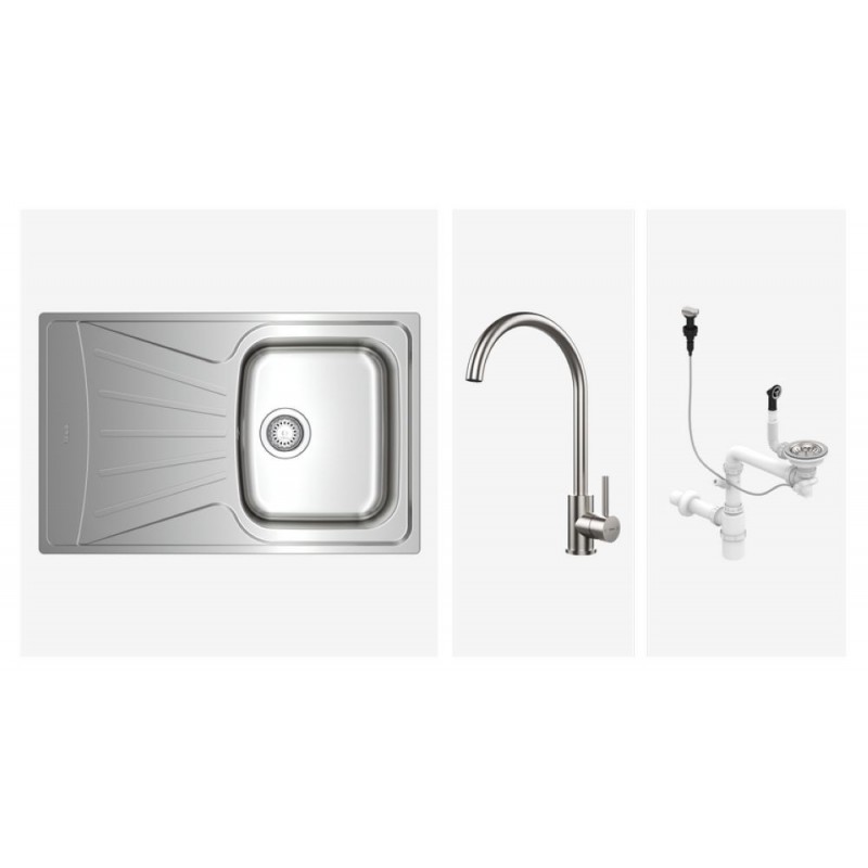 El grifo incluido, también en acero inoxidable, cuenta con una válvula sencilla que facilita el control del caudal y la temperatura del agua. Su diseño combina perfectamente con el fregadero, creando una estética uniforme y elegante. Además, el kit incorpora un sifón que mejora la evacuación del agua y evita malos olores.
