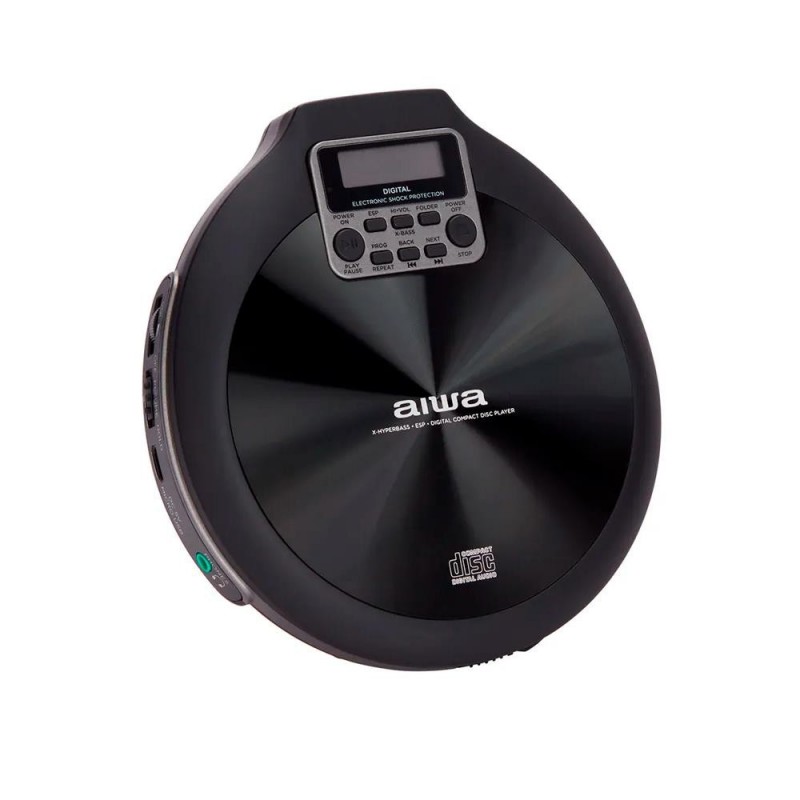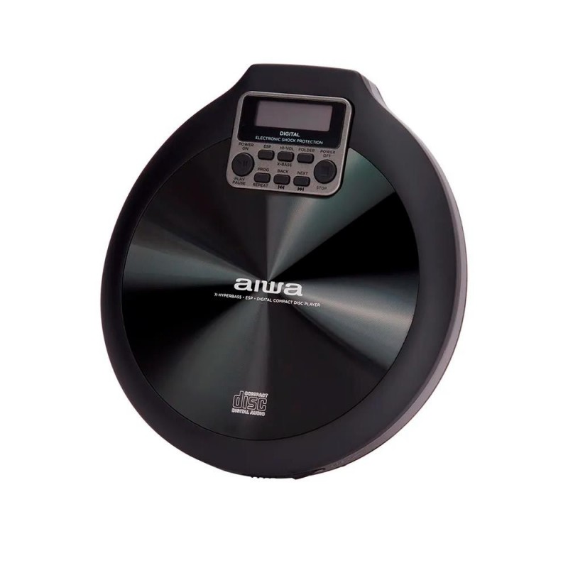 Discman Aiwa de color negro con baterías de 1500mAh, conexión jack 3.5 para auriculares y microUSB para carga.