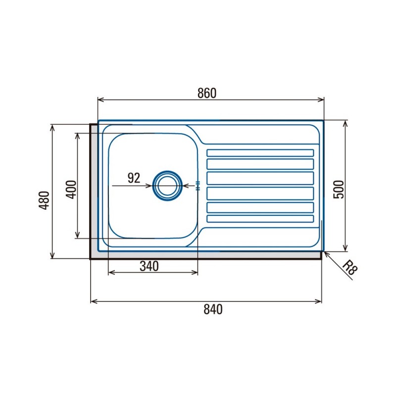 Fregadero Sobre Encimera de acero inoxidable para mueble de 45 cm de una cubeta y escurridor, izquierda. Desagüe con válvula con canasta 3½"" y sifón.