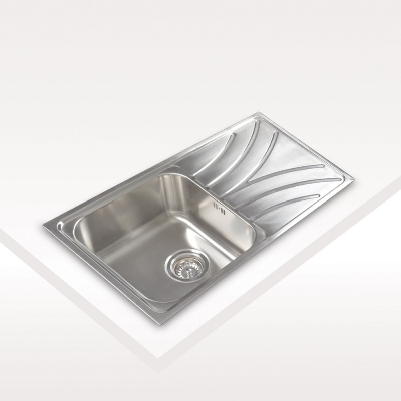 Fregadero Sobre Encimera de acero inoxidable para mueble de 45 cm de una cubeta y escurridor, izquieda. Desagüe con válvula con canasta 3½"" y sifón.