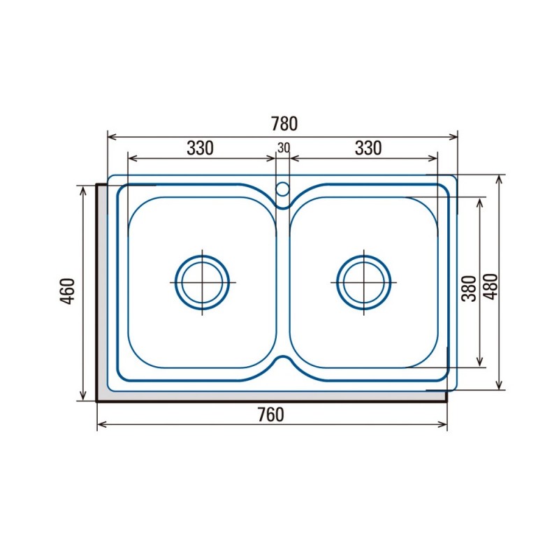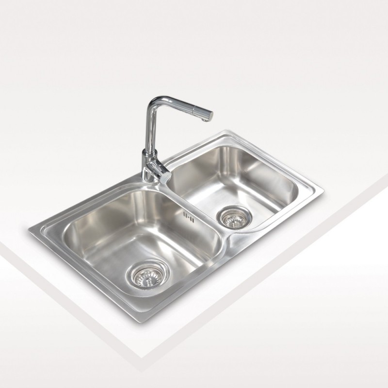Fregadero Sobre Encimera de acero inoxidable para mueble de 80 cm de dos cubetas. Desagüe con válvula con canasta 3½"" y sifón.