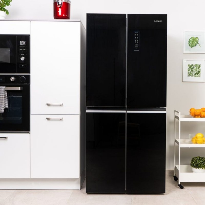 Frigorífico americano de 4 puertas Aspes A418800ENFN con diseño elegante en cristal negro y tecnología No Frost que evita la formación de escarcha. Este modelo está pensado para quienes buscan capacidad, eficiencia y estilo en un solo electrodoméstico. Su sistema Dual Cooling permite mantener la temperatura óptima en cada compartimento, conservando los alimentos frescos durante más tiempo.