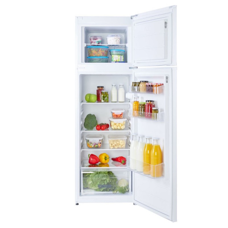 Frigorífico de dos puertas de libre instalación en color blanco; eficiencia energética F y 144 cm de alto y 54 cm de ancho.