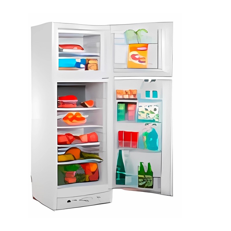 Frigorífico de dos puertas con funcionamiento mediante gas butano o electricidadad en color blanco y con una altura de 1.63 metros.