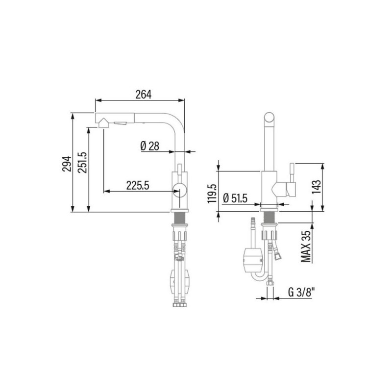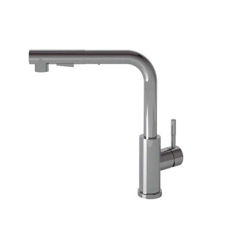 Grifo de cocina monomando Maneral extraible Acero inoxidable - Caño alto Caño giratorio 360° Aireador anticalcáreo Reductor de caudal a 5,7l/min Función Ducha Caño en forma de L Acabado cromado Sin Plomo Cartucho cerámico Dimensiones del grifo: Altura 294 mm / Altura de caída agua: 251,5 mm
