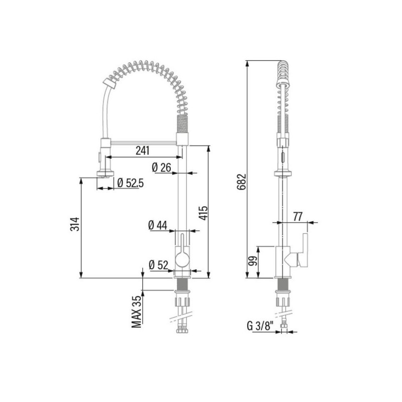 Grifo de cocina monomando Caño extraible - Tipo Semi profesional Latón - Caño alto Cartucho cerámico Apertura en frío Caño giratorio 360° Acero Inoxidable 304 Mando tipo tirador en el lateral derecho Estilo pescadera Función Ducha Aireador anticalcáreo con Reductor de caudal a 5,7l/min Acabado Cromado Conexiones flexibles M10x1x3/8 en Acero Inoxidable certificadas Dimensiones del grifo: Altura 682 mm / Altura de caída agua: 314 mm