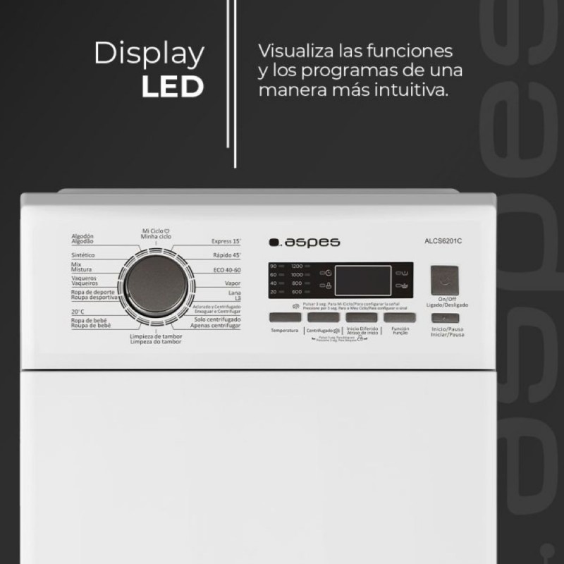 Lavadora de carga superior con diseño compacto y funcional, ideal para hogares que buscan eficiencia sin renunciar al rendimiento. Con una capacidad de 6 kg y velocidad de centrifugado de hasta 1200 rpm, esta lavadora Aspes se adapta perfectamente a las necesidades diarias de lavado, incluso en espacios reducidos.