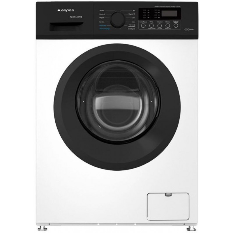 Lavadora de carga frontal con diseño moderno en blanco y puerta negra XXL, la ASPES AL7204AIDVB ofrece una capacidad de 7 kg y una velocidad máxima de centrifugado de 1200 rpm. Su motor Digital Inverter garantiza un funcionamiento eficiente, silencioso y duradero, con una clasificación energética A que ayuda a reducir el consumo eléctrico en cada lavado.