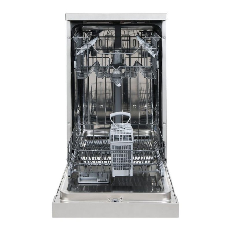 Su diseño en inox aporta un toque moderno y elegante a cualquier cocina. Dispone de dos bandejas ajustables en altura y una cesta para cubiertos, optimizando el espacio interior y permitiendo una distribución eficiente de la carga. Los brazos rociadores aseguran una limpieza uniforme en todos los rincones, incluso en utensilios más difíciles.