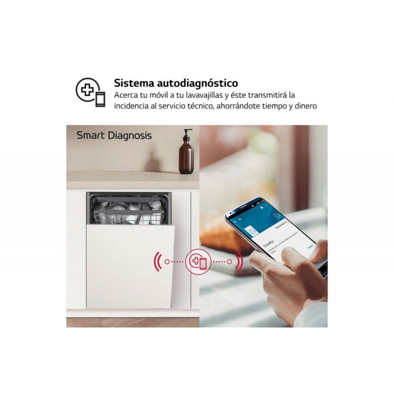La conectividad con la app LG ThinQ™ permite recibir notificaciones del ciclo, descargar nuevos programas y personalizar configuraciones desde tu smartphone. Esta función aporta comodidad y control en cada lavado, permitiendo adaptar el lavavajillas a tus necesidades en todo momento.