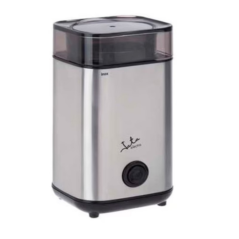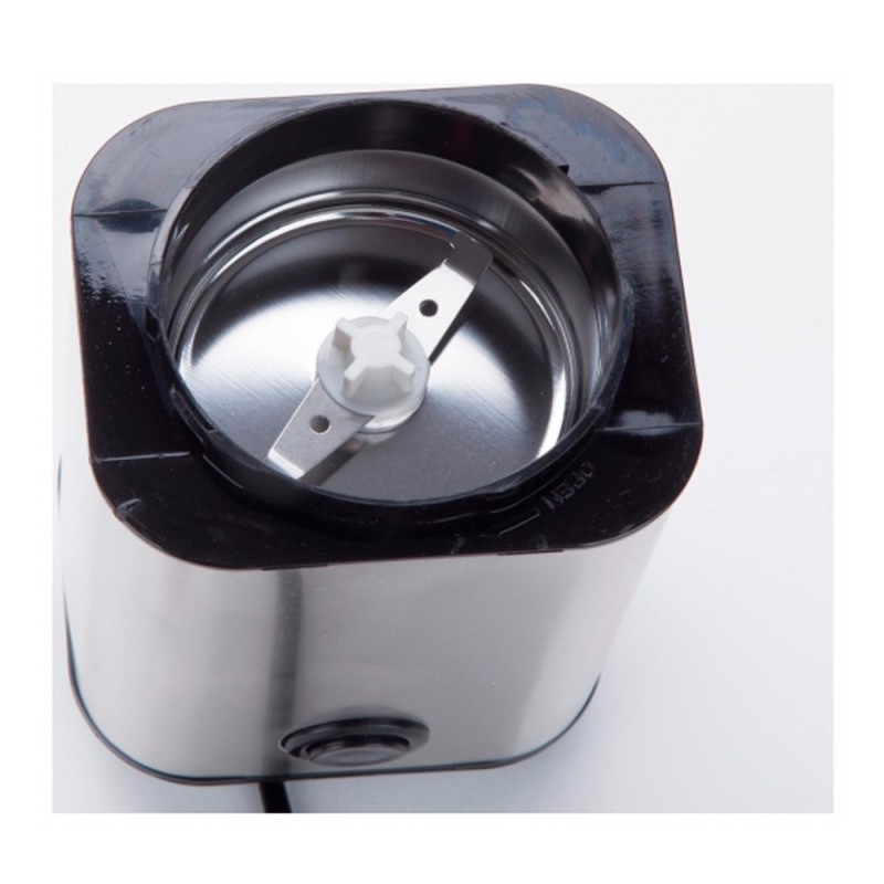 Molinillo de café con cuerpo, recipiente y cuchilla en acero inoxidable y capacidad de 55 gramos.