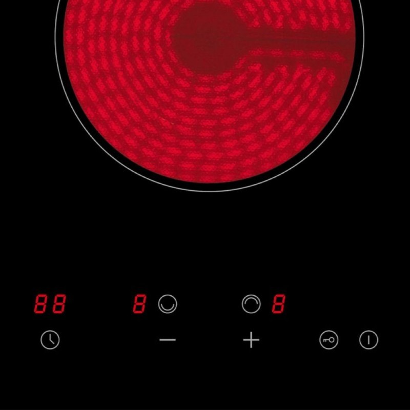 Cuenta con dos zonas de cocción cerámicas que proporcionan una potencia total de 3000 W. La primera zona, de 165 mm, alcanza 1200 W, mientras que la segunda, de 200 mm, llega a 1800 W. Gracias a sus 9 niveles de potencia, podrás ajustar la intensidad según el tipo de receta, desde un suave calentamiento hasta una ebullición rápida.