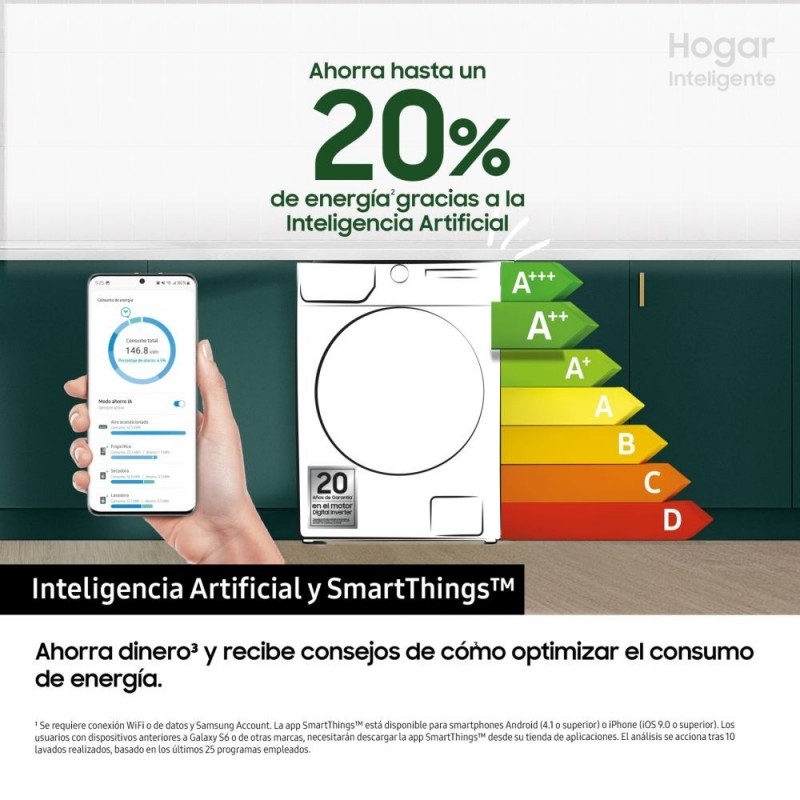 La conexión Wi-Fi y la compatibilidad con SmartThings permiten gestionar y monitorizar el ciclo de secado desde cualquier lugar. SmartThings Energy te ayuda a controlar el consumo de energía, mientras que SmartThings Home Care facilita el mantenimiento del electrodoméstico notificando la necesidad de reemplazos o actualizaciones de software.