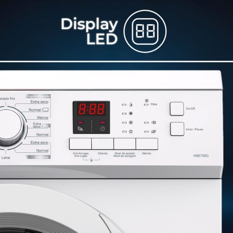 En cuanto al diseño, la HSE700C presenta una estética blanca moderna con puerta transparente, lo que facilita la visualización del interior. El tambor galvanizado de 97,5 litros ofrece espacio suficiente para que la ropa se mueva libremente, mejorando el secado y evitando el desgaste de las prendas. El chasis estándar y el tipo de carga frontal hacen que sea fácil de instalar en cualquier rincón del hogar.