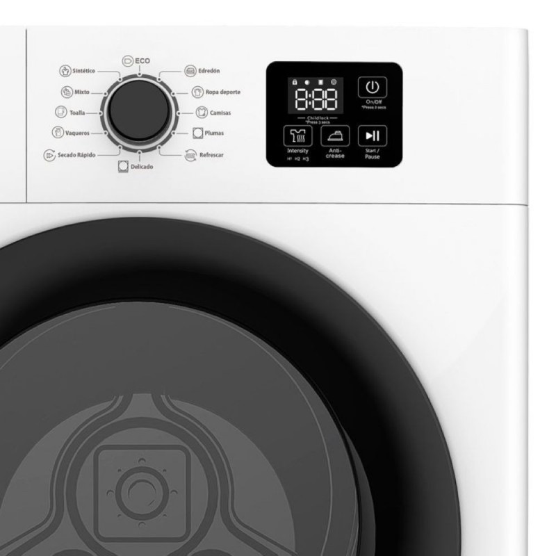 En cuanto a diseño, la secadora presenta una estética blanca con puerta XXL transparente, que facilita la carga y descarga de ropa. El control electrónico con Display LED manual permite seleccionar entre 12 programas distintos, adaptándose a todo tipo de tejidos: desde camisas y ropa deportiva hasta edredones y prendas delicadas. La función antiarrugas es especialmente útil para mantener la ropa lista para usar.