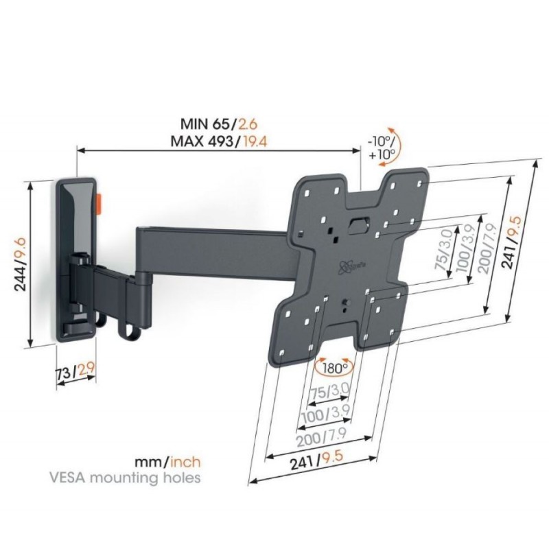 Las dimensiones del soporte son: distancia mínima a la pared de 65 mm y máxima de 493 mm. Gracias a sus brazos extensibles, puedes ajustar la posición del televisor según tus necesidades. Un producto pensado para mejorar tu experiencia visual sin complicaciones.