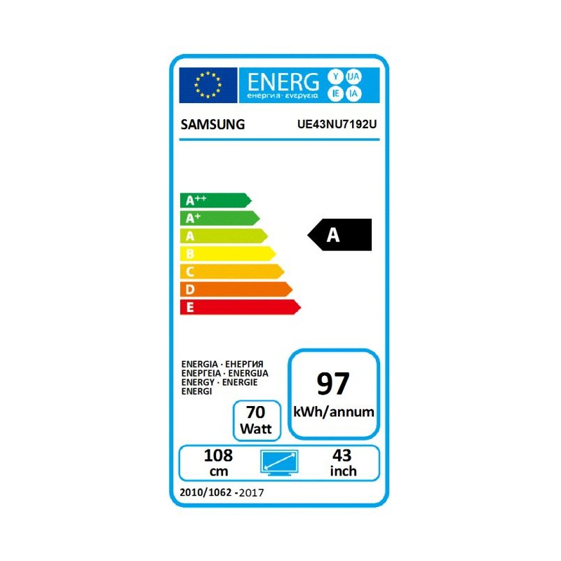 El televisor posee clasificación energética A, lo que garantiza un consumo eficiente y responsable con el medio ambiente. Su consumo promedio es de solo 70 W, con un gasto anual aproximado de 97 kWh. En cuanto a sus dimensiones, mide 970,2 mm de ancho, 563,2 mm de alto y 58,8 mm de profundidad sin soporte, con un peso ligero de 9,6 kg que facilita su instalación en cualquier espacio del hogar.