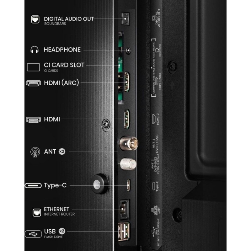 En cuanto al sonido, este modelo incorpora dos altavoces con potencia RMS de 16 W y decodificadores Dolby Atmos, ofreciendo una experiencia envolvente sin necesidad de subwoofer. También cuenta con ecualizador y canal de retorno de audio mejorado (eARC), ideal para conectar sistemas de sonido externos.