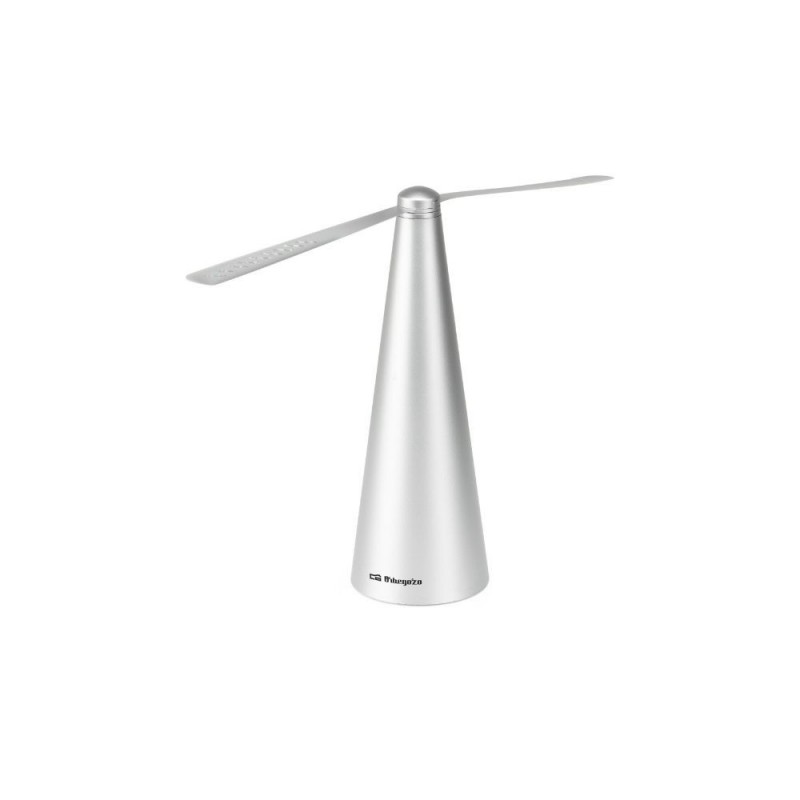 Ventilador de sobremesa con hélice rotatoria y tiras reflectantes repelentes de moscas.