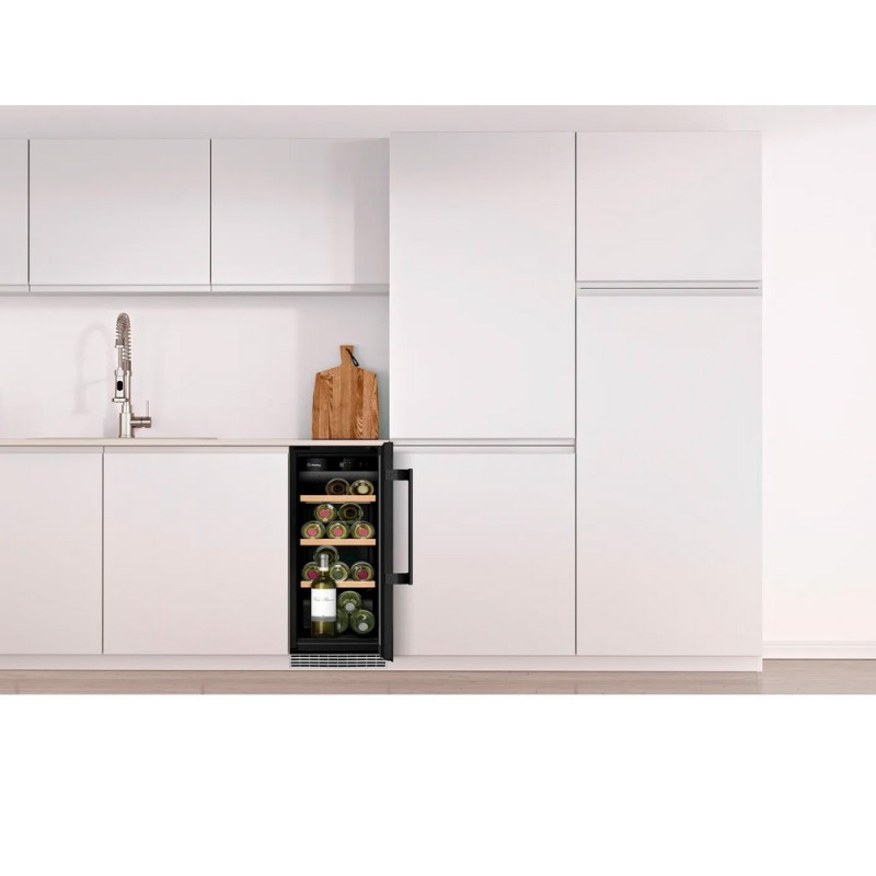 General: Capacidad de botellas de 75 cl:21 Apertura de puerta:Derecha reversible Numero de zonas de temperatura:1 Temperatura ajustable:Si Puerta de cristal:Si Tipo de puerta de cristal:3 glass panels, UV-filter Clase de eficiencia energética:F Promedio anual de consumo de energía en kilovatios hora por año (kWh/a):100 kWh/annum Emisiones de ruido aéreo:38 dB(A) re 1 pW Clase de emisiones de ruido aéreo:C Tipo de construcción:Nº de motocompresores:1 Tipo de construcción:Integrable Apertura de puerta:Derecha reversible Puerta reversible:Si Opción de puerta panelable:No posible Sistema de filtro:No Tipo de instalación:Encastrable bajo encimera Numero de zonas de temperatura:1